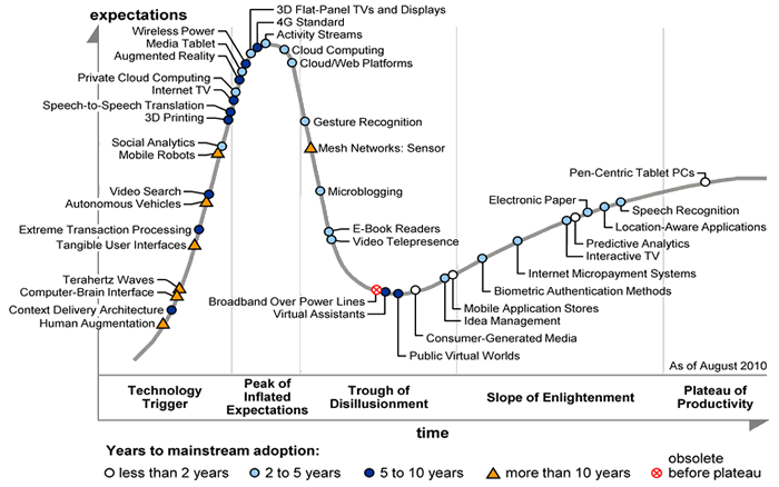 The annual 2010 Gartner technology hype-cycle report is out - and wouldn't you know cloud computing, cloud-web platforms and private clouds are all at or near the top of the peak of expectations section of the curve.Now to be clear - Gartner, which is focused on large enterprise IT departments , uses the term cloud computing a bit differently than I do on this blog - they generally mean the idea of large IT CIOs using "iron in the sky" like Amazon EC2 as a place to run their computing workloads instead of on servers in their own data centers. Gartner rates Software as a Service applications like Intact and Salesforce much closer to the plateau of productivity.